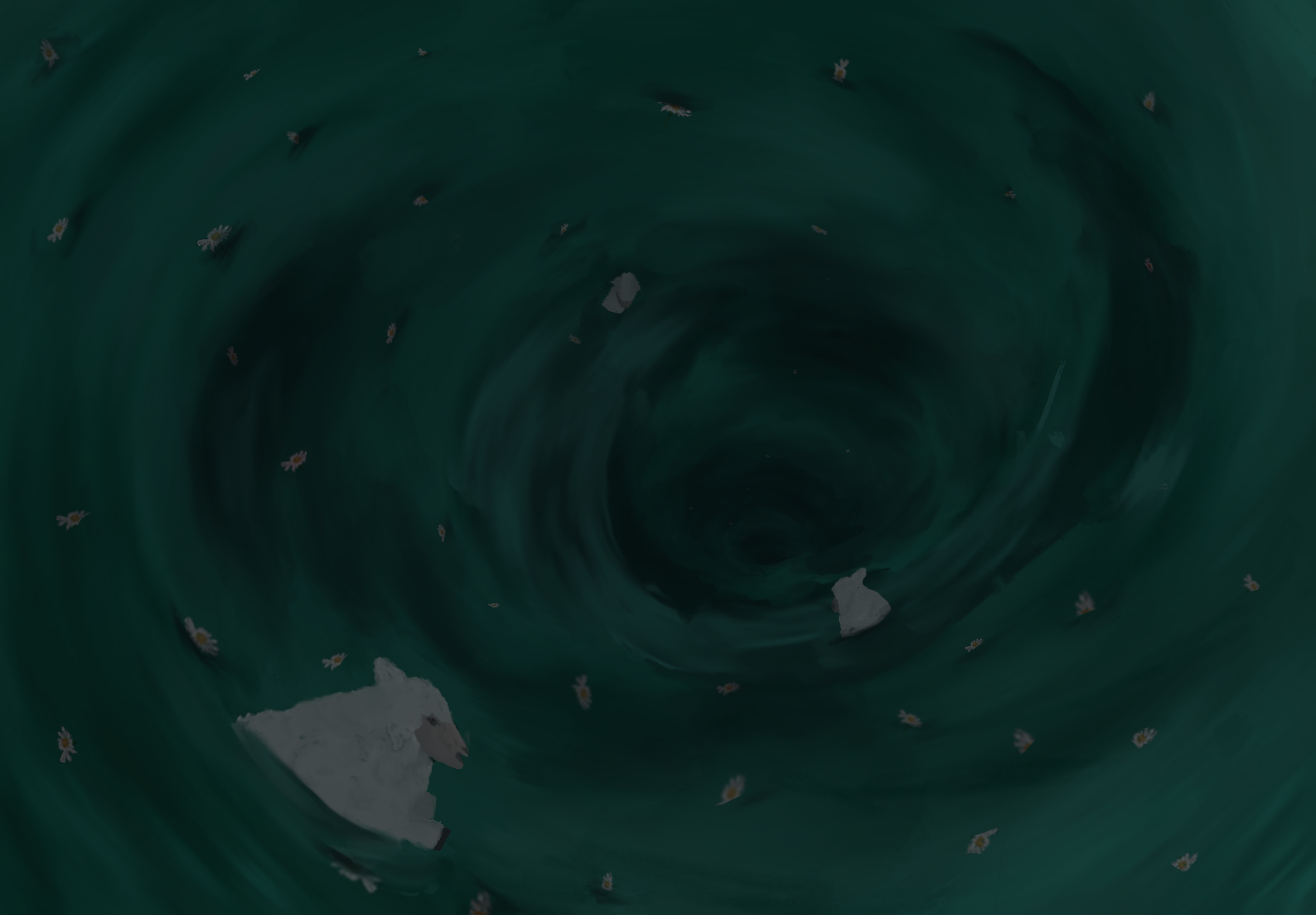 This piece is one I had contemplated for a long time prior to its creation. I often struggle to articulate my emotions, and I frequently associate these complex internal states with water. The imagery of a whirlpool, in particular, repeatedly emerges in my work, symbolizing the sensation of being pulled into an inescapable downward spiral. This emotional turbulence is closely tied to a perceived loss of innocence. Throughout art history, lambs and daisies have commonly symbolized innocence and purity, as seen in the works of artists such as Giotto, William-Adolphe Bouguereau, and Claude Monet. Drawing inspiration from these historical references, I incorporated these motifs to visually express the emotional themes present in this piece.